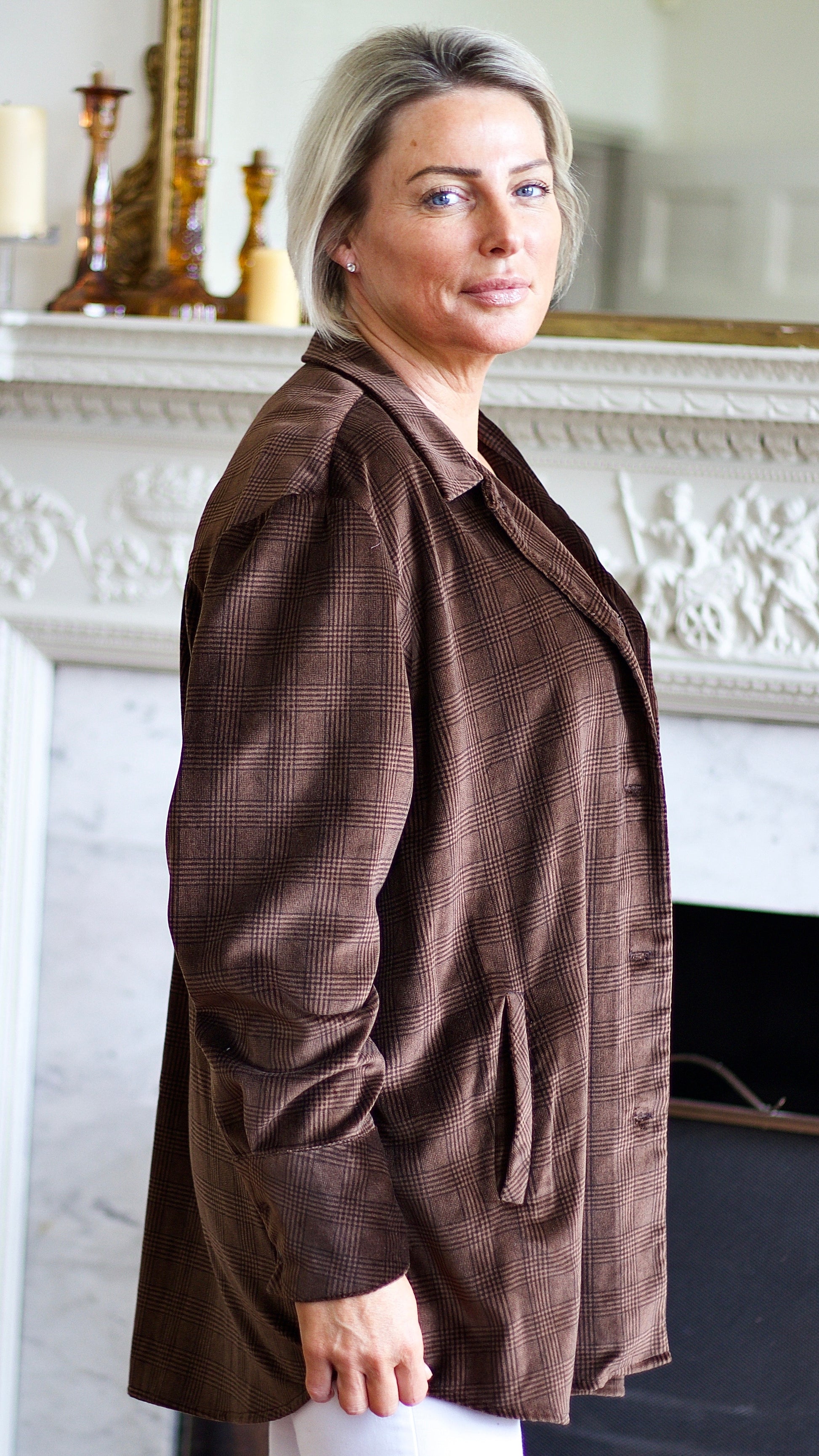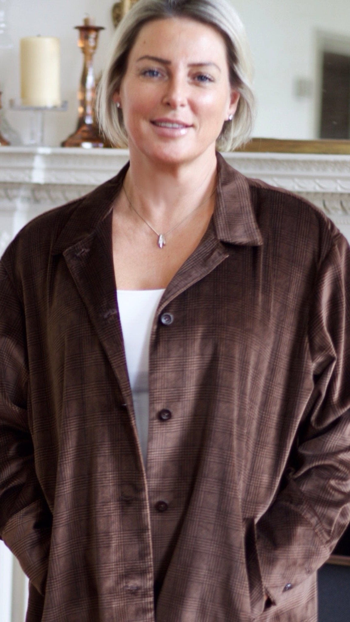 Our oversized shirt is made from the softest and finest cotton velvet in a rich chocolate check. It's comfortable and flattering with welt pockets, a back pleat, and distinctive leather buttons. It has been exquisitely and carefully crafted by our master tailors in our London studio. This versatile piece seamlessly combines style and sustainability, sourced from high-quality deadstock fabric from a renowned fashion house in Britain. Whether you're exploring the countryside or heading out for dinner, it can be worn as a shirt or as an overshirt sliding it over your favourite tee, turtleneck, or jumper.