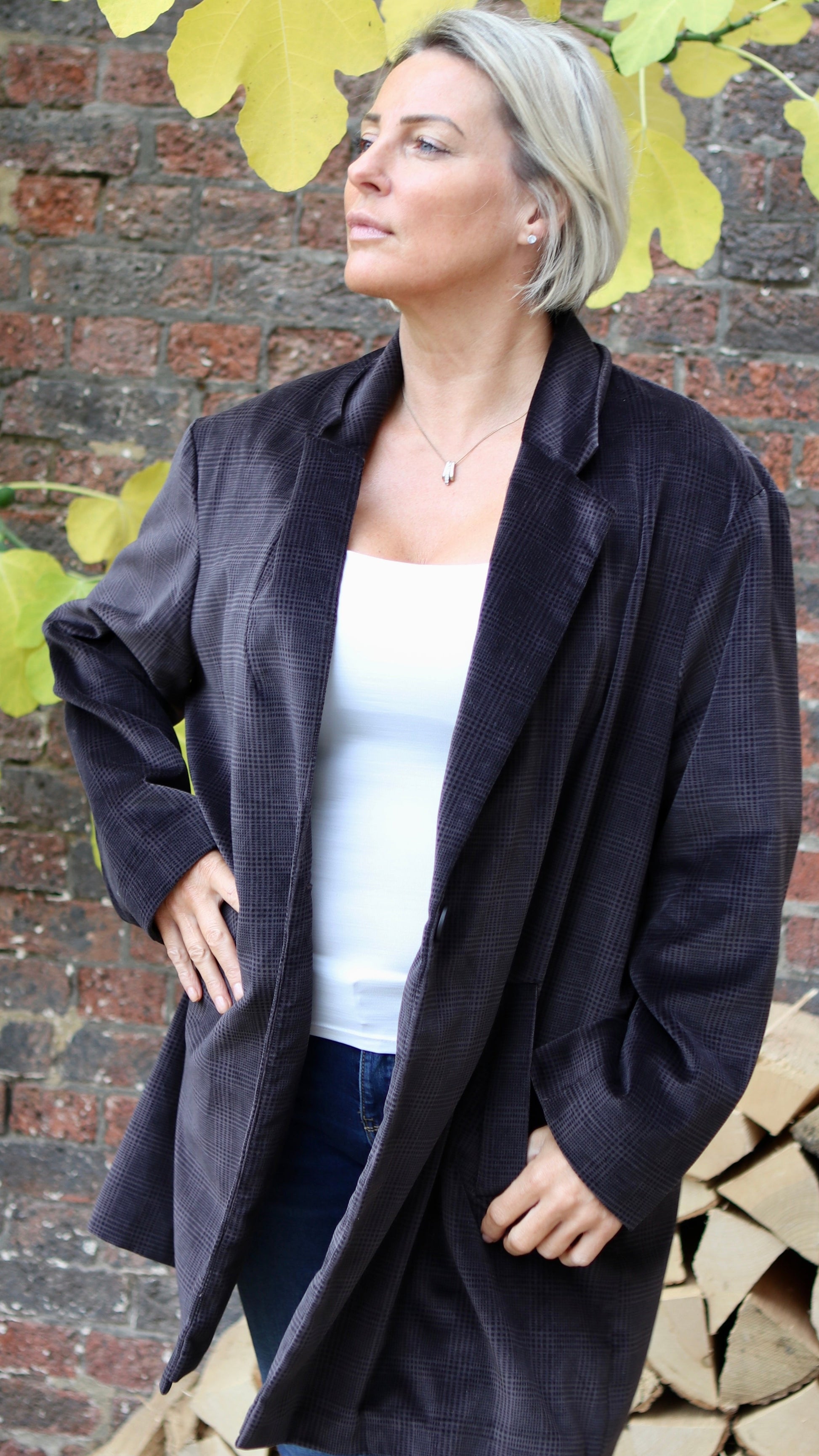 Our Bond Street oversized jacket is made from 100% premium cotton velvet, which is repurposed from a leading French fashion house. The velvet fabric has an innate sheen, making its colours dance with the light. The check pattern, a rich black which contrasts against a base that shifts between falcon grey and a deep espresso brown, depending on the lighting.